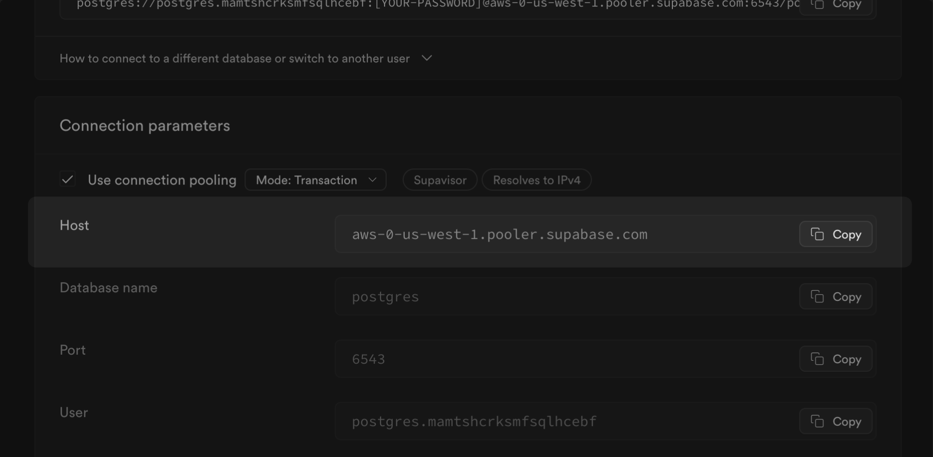 Under the Session pooler, click on the View parameters under the connect string. Note your Host (