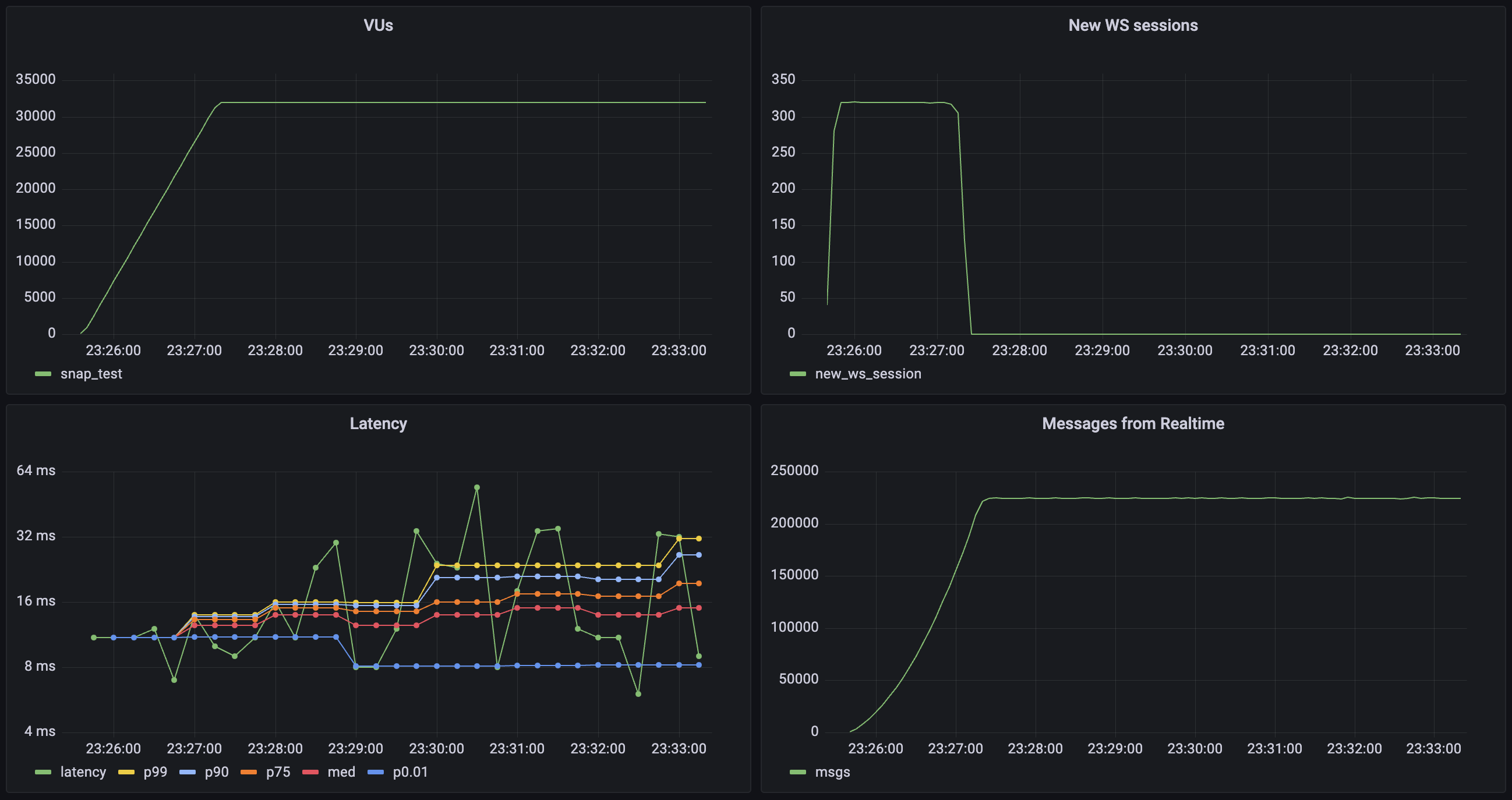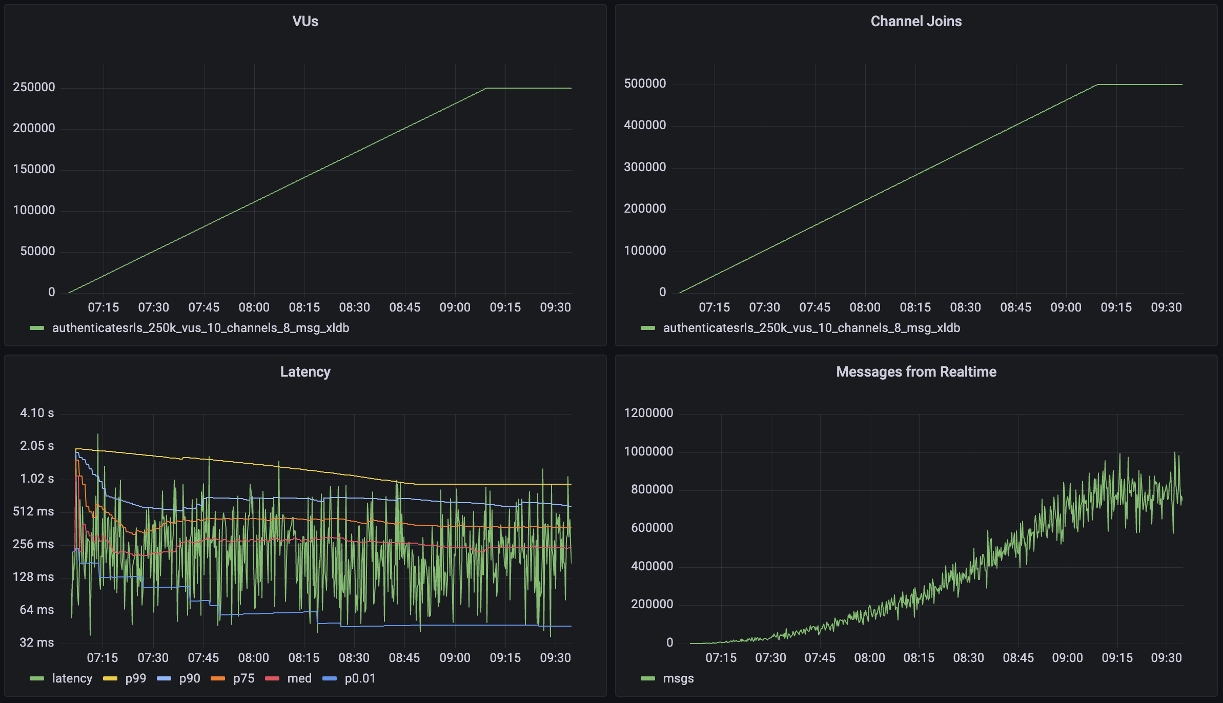 This workload demonstrates Realtime's capability to handle high-scale scenarios with a large number of concurrent users and broadcast channels. The test simulates a scenario where each user participates in group communications with periodic message broadcasts. Each virtual user (VU):